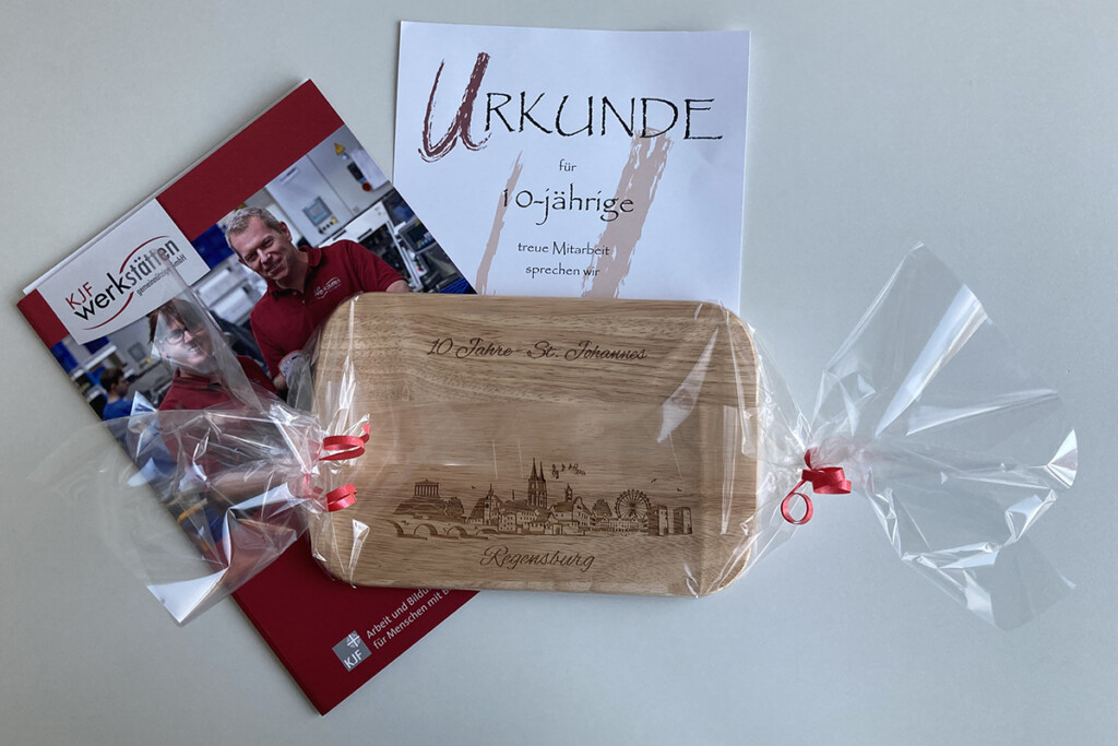 Einrichtungsleiter Herr Lauer bezeichnete die St. Johannes Werkstätte als sicheren Hafen im Berufsleben und die Jubilare als zuverlässigen Anker im Bereich der Montage. Anschließend gratulieren die beiden Bereichsleitungen Frau Rappl und Herr Weinzierl und der Werkstattratsvorsitzende Herr Hanseder den Damen und Herren zu ihrem Ehrentag.