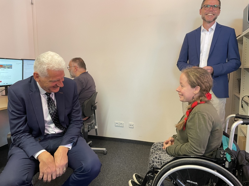 Bei einem politischen Sommerbesuch in der St. Johannes Werkstätte der KJF Werkstätten gGmbH informierten sich Staatssekretär im Bundesministerium für Arbeit und Soziales (BMAS) Dr. Rolf Schmachtenberg und Martin Weiland, Sonderbeauftragter für die Einheitlichen Ansprechstellen für Arbeitgeber (EAA), über aktuelle Herausforderungen für Werkstätten für behinderte Menschen (WfbM) und Inklusionsbetriebe, in denen Menschen mit Beeinträchtigungen einer Beschäftigung nachgehen.