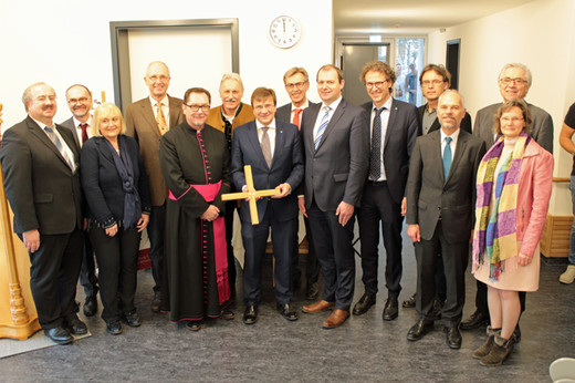 Domkapitular Dr. Batz zelebrierte die Segensfeier in einem feierlichen Rahmen, musikalisch begleitet von den Gitarrenklängen Georg Deisenrieders, Pastoralreferent in der KJF, und unterstützt von Christine Bachmaier. Sie las die Geschichte von den drei goldenen Äpfeln vor, der bekannten Legende über den Bischof von Myra. Anschließend segnete Domkapitular Dr. Roland Batz die Kreuze und die Räume der neuen Förderstätte, in denen die Kreuze ihren Platz finden werden. Sie entstanden in der Zusammenarbeit des Künstlers und Bildhauers Joseph Michael Neustifter mit den Schreinern aus den Eggenfeldener Werkstätten. Einrichtungsleiter Alfred Miller freut sich sehr darüber. Bei der Segnungsfeier bedankte er sich bei allen Förderern und Unterstützern, der Organisatorin der Feier Martina Fürst und dem Kammerchor des Gymnasiums Eggenfelden – insbesondere bei Chorleiter Korbinian Angerer und Schulleiter Markus Enghofer – der die neue Förderstätte mit viel Musikalität und Wärme erfüllte.