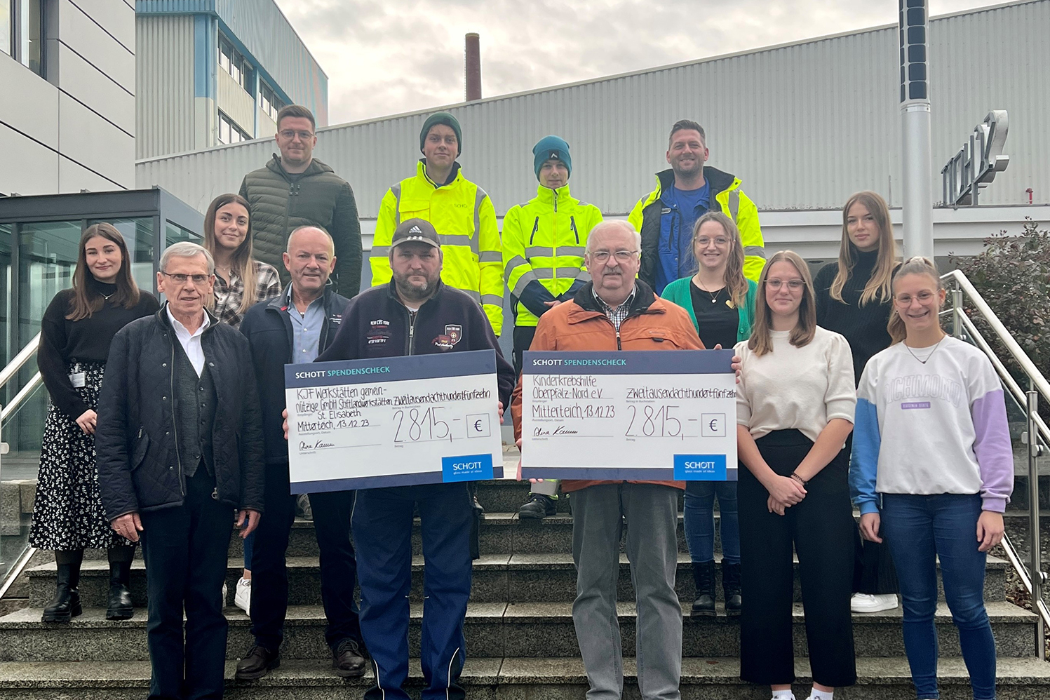 Im Rahmen ihres jährlichen Auszubildendenprojekts fertigten die Azubis der SCHOTT AG in Mitterteich Windlichter aus Glas, die unter der Belegschaft und am Weihnachtsmarkt in Mitterteich verkauft wurden. Die Einnahmen aus diesem Projekt spenden die Auszubildenden sozialen Einrichtungen in der Region. In diesem Jahr kam die stattliche Summe von 5.630 Euro zusammen, die je zur Hälfte der Kinderkrebshilfe in der Region Oberpfalz Nord e.V. und den Stiftlandwerkstätten St. Elisabeth übergeben wurde.