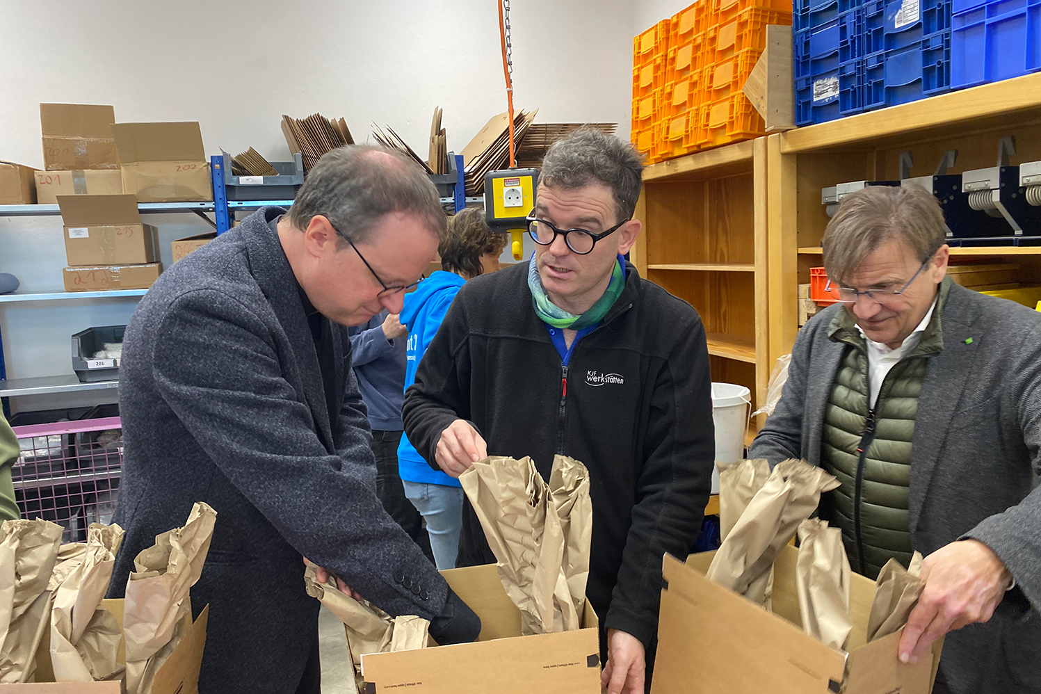 In diesem Jahr war Domkapitular Michael Dreßel, der Vorsitzende der Katholischen Jugendfürsorge der Diözese Regensburg, Ehrengast beim Päckchen packen. „Jeder von uns ist beschenkt: wir alle können in Frieden und ohne Angst vor Drohnenangriffen leben. Deshalb sollten wir etwas zurückgeben und dort helfen, wo unsere Hilfe gebraucht wird. Theo ist ein sehr wertvolles Projekt, es ist wunderbar, wenn ich mich daran beteiligen kann“, sagte er. Christa Weiß, die Vorsitzende des Vereins für körper- und mehrfachbehinderte Menschen e.V. (vkm), ist sehr zufrieden mit dem bisherigen Verlauf: „Mit dem Regensburger Weihnachtssingen haben wir großen Aufschwung erlebt. Unser Ziel ist es, Theo im nächsten Jahr zu verwirklichen, damit starten wir jetzt in den Endspurt. Wir sind allen dankbar, die uns dabei unterstützen. Ich bin beeindruckt, mit wie viel Liebe und Sorgfalt die Mitarbeiterinnen und Mitarbeiter hier die Päcken packen.“