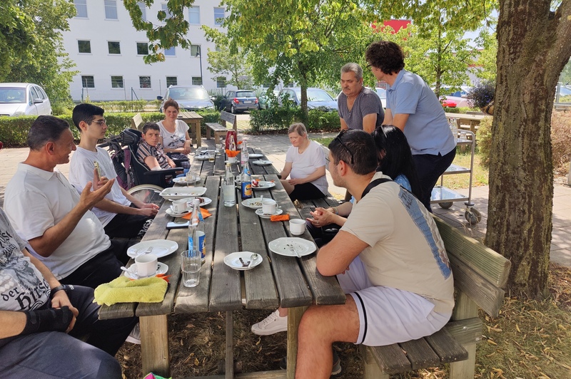 Zudem erfolgte ein Treffen mit einer Familie aus der Ukraine, welche einem Mitarbeiter mit Behinderung in seiner Mittagspause, während er in der Stadt unterwegs war, geholfen hatte. Er wies deutlichen Unterzucker auf und wurde ohnmächtig. Um Dank dafür auszusprechen, lud Herr Miller, der Einrichtungsleiter der KJF Werkstätten gemeinnützige GmbH, die Familie in die Werkstätte für Menschen mit Behinderung (WfbM) ein. Es wurde ihnen die WfbM gezeigt sowie die Produktion. Diese Familie stand den Tätigkeiten der WfbM sehr positiv gegenüber und alle waren überrascht, dass das Angebot der WfbM so breit gefächert ist. Im Anschluss fand ein gemeinsames Beisammensein mit Kaffee und Kuchen statt. Auch hier zeigt sich, dass die Sprache nicht das ausschlaggebende Kriterium ist um zu kommunizieren, sondern eine positive Grundeinstellung gegenüber Menschen. Es war ein schönes, informatives Beisammensein, da ein Mitarbeiter der WfbM vom Russischen ins Deutsche und umgekehrt übersetzen konnte.