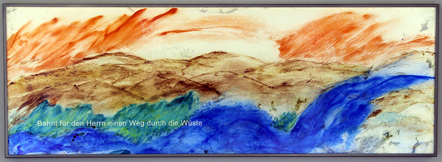 Welche Gedanken und Empfindungen löste das Bild bei den Beschäftigten in der St. Johannes Werkstätte aus? Sonne, Wüste, Wasser und frisches Grün – da ist zum Beispiel ein langer, schwieriger Weg bis in die Werkstätte, da gibt es Veränderungen in der Gruppe, auch Zweifel und Hoffnung, was den eigenen beruflichen und persönlichen Lebensweg anbelangt. Die Rückmeldungen der jungen Leute sind persönlich und sehr unterschiedlich – sie spiegeln den jeweils individuellen Zugang zu Böschls Bild wider.