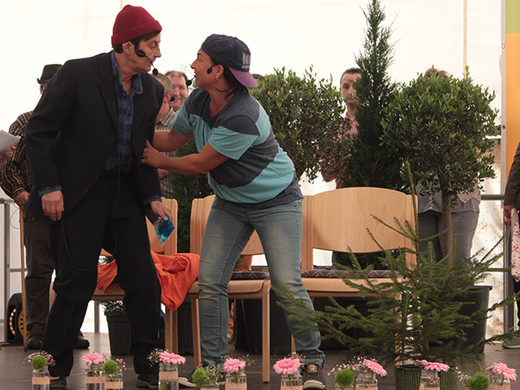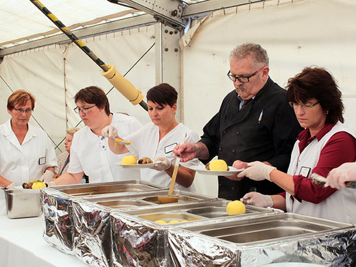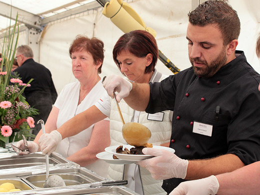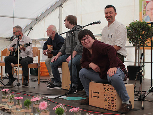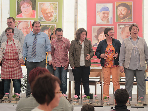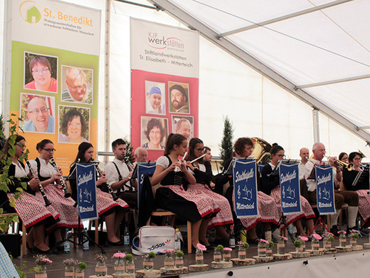 Vor dem Mittagessen im Festzelt ehrten die Einrichtungsleitungen Elke Bauer und Dr. Karl Kick langjährige Mitarbeiterinnen und Mitarbeiter sowie Bewohnerinnen und Bewohner. Weiter ging es mit einem unterhaltsamen Programm, an dem die Theatergruppen der Wohngemeinschaften St. Benedikt, die Stadtkapelle Mitterteich, die Werkstätten-Band „The Inclusions“ und die Neidaffer Plattler beteiligt waren. Für Schleckermäuler gab es auf einem Markt bei den Wohngemeinschaften viel Selbstgemachtes, z.B. Liköre, Öle und Marmeladen, Trüffelpralinen, Kartoffelwaffeln und Schokofrüchte.