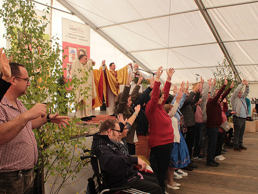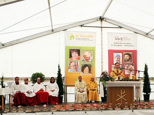 In den Mitterteicher Einrichtungen der KJF und der KJF Werkstätten gemeinnützige GmbH verbinden sich beispielgebend Engagement, Herzblut und Fachlichkeit - ganz im Dienste der Menschen mit Behinderung. In Mitterteich inklusiv arbeiten und wohnen, das kann man unter dem Dach der KJF. Mit einer Jubiläumsfeier honorierten die Verantwortlichen die jahrzehntelange Arbeit mit und für Menschen mit Behinderung. Das Fest begann mit einem Gottesdienst im Festzelt auf dem Gelände der Werkstätte, den der 1. Vorsitzender der Katholischen Jugendfürsorge, Domkapitular Dr. Roland Batz, mit den Konzelebranten Prälat Dr. Josef Schweiger, Kaplan Dr. Matthias Nowotny von der Pfarrei Mitterteich und dem Konnersreuther Pfarrseelsorger Pater Benedikt Leitmayr feierte. „Es ist gut, dass wir dieses Doppeljubiläum mit der Eucharistie beginnen“, sagte Domkapitular Dr. Roland Batz, „denn Eucharistie heißt ‚Danke sagen‘ für die Begleitung durch das Leben mit seinen Höhen und Tiefen. Danken gehört zum täglichen Miteinander.“