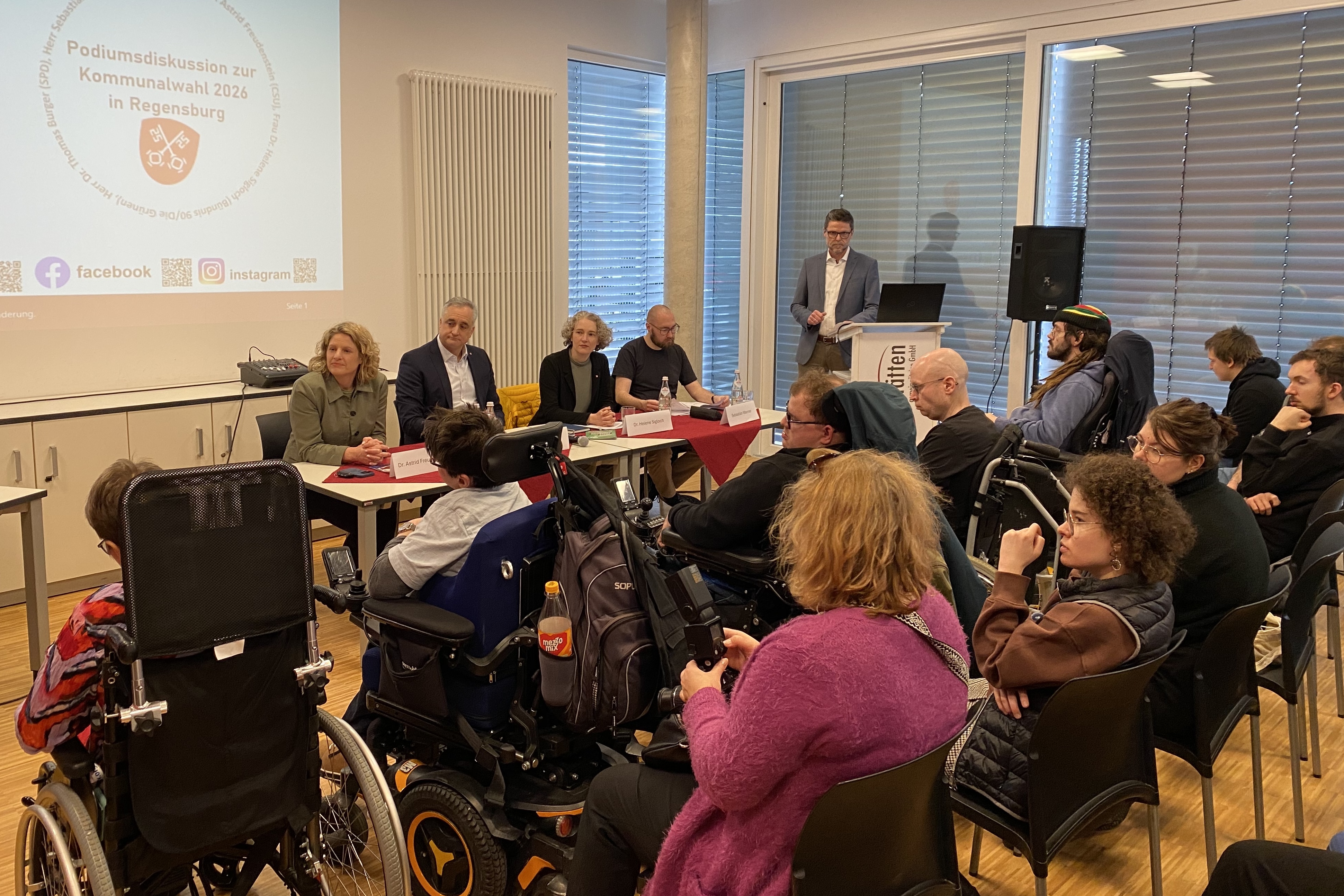 Die Regensburger OB-Kandidatinnen und OB-Kandidaten Astrid Freudenstein (CSU), Thomas Burger (SPD), Helene Sigloch (Die Grünen) und Sebastian Wanner (Die Linke) waren zu Gast in der St. Johannes Werkstätte. Sie stellten ihre Pläne für Inklusion und Barrierefreiheit vor und gingen auf die Fragen der etwa 35 Mitarbeiterinnen und Mitarbeiter ein.
