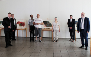 Bei einem Kreativ-Workshop im Herbst 2019 entdeckte die Leiterin des Ateliers KUNST inklusiv, Renate Höning, das große Talent von Ardijan Gash. Ihr sei es zu verdanken, dass Ardijan Gash aber auch andere Teilnehmer aus der Werk- und Förderstätte ihre Kreativität entfalten konnten, so der Leiter der Stiftlandwerkstätten Dr. Karl Kick in seiner Begrüßung. Insgesamt fünf Teilnehmer aus Mitterteich hätten Kunstwerke eingereicht. KJF-Direktor Michael Eibl bedankte sich bei den Mitarbeiterinnen und Mitarbeitern der Stiftlandwerkstätten, welche die Preisverleihung unter Corona-Bedingungen im kleinen Kreis ermöglicht hatten. „Ich möchte Ihnen allen ein großes Dankeschön aussprechen für alles, was hier geleistet wird", so Eibl, „Sie sorgen und kümmern sich bis in die Familien hinein, um alles mitzutragen und zu bewältigen. In einem guten Miteinander haben Sie die letzten Wochen und Monate gemeistert."
