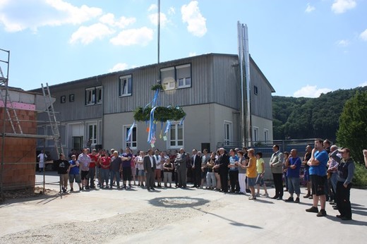 Das Arbeitsangebot in den Produktionsbereichen Küche, Hauswirtschaft, Montage und Verpackung reichte jedoch nicht mehr aus, sodass eine Erweiterung notwendig wurde. Im April trafen sich der Geschäftsführer der KJF Werkstätten Hans Horn, KJF-Direktor Michael Eibl, Prälat Dr. Josef Schweiger und eine Reihe von Ehrengästen gemeinsam mit den Beschäftigen und Mitarbeitern/innen zum Spatenstich. Nur drei Monate später wurde jetzt das Richtfest gefeiert. Den Richtspruch gab Patric Bornmann vom Bauunternehmen Herdegen & Rödl zum Besten. Die Bauarbeiten schreiten ohne Zwischenfälle zügig voran.