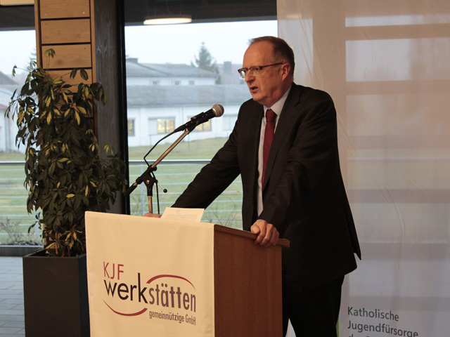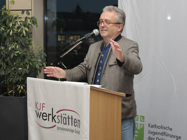 In Vertretung von Michael Eibl, Direktor der KJF, und mit dessen besten Wünschen, begrüßte Johannes Magin, Abteilungsleiter Teilhabeleistungen für Jugendliche und Erwachsene, die anwesenden Gäste. Er führt ihnen die Bedeutung der Förderstätte als zweitem Lebensort für die Teilnehmerinnen und Teilnehmer vor Augen: „Sie bieten Menschen mit umfassenden und schwerwiegenden Beeinträchtigungen wesentliche Voraussetzungen für Teilhabe. Soziale Teilhabe gelingt dort in der Gemeinschaft, Teilhabe am Arbeitsleben gelingt durch gezielte Förderung beim Erwerb von Fähigkeiten." Magin bedankte sich bei Architekt Peter Pracht und den Vertretern der Projektanden, die das Bauprojekt zügig und sorgfältig durchgeführt haben. Sein besonderer Dank galt den Förder- und Zuschussgebern: Freistaat Bayern (1,2 Millionen Euro), Bezirk Oberpfalz (196.000 Euro) und Aktion Mensch (110.000 Euro) sowie der Katholischen Jugendfürsorge für den Einsatz von Eigenmitteln. Etwa 300.000 Euro mehr als ursprünglich veranschlagt kostet der Erweiterungsbau und damit rd. 2,5 Mio. Euro, was auch mit konjunkturell bedingten Preissteigerungen in der Baubranche zu tun hat.