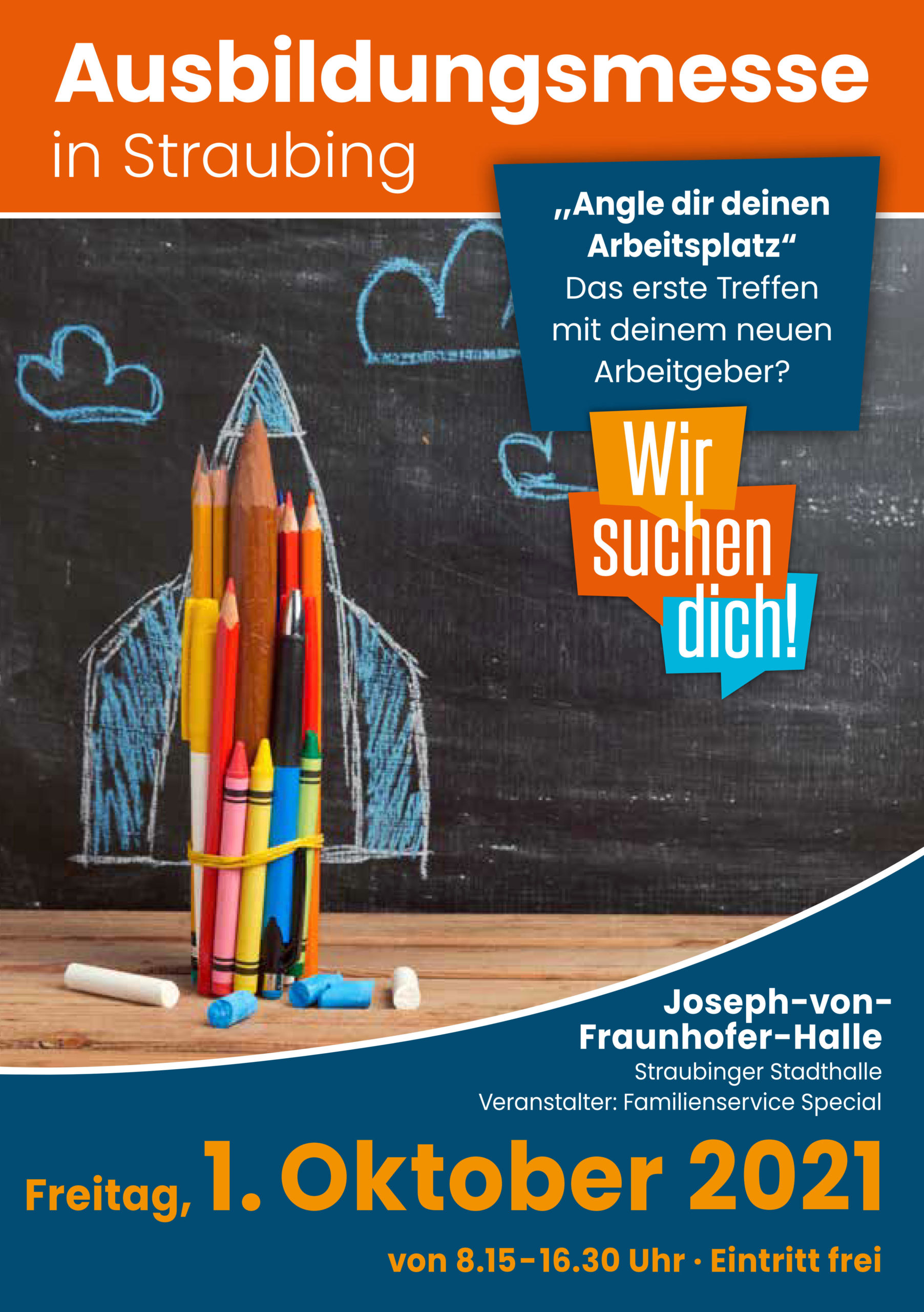 Triff uns an unserem Messestand bei der Ausbildungsmesse "Angle dir deinen Arbeitsplatz" in der Joseph-von-Fraunhofer-Halle in Straubing am Freitgag, den 1. Oktober 2021! Wir freuen uns darauf, dich kennenzulernen.